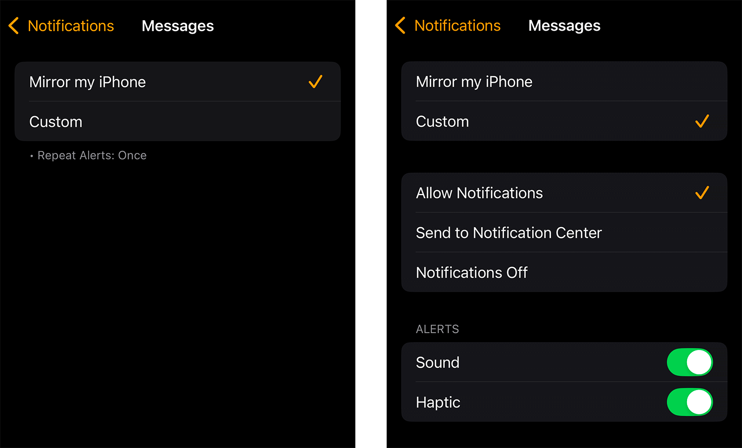 Tap Custom to reveal additional options where applicable. In Messages, for instance, you choose to get audio and haptic alerts.