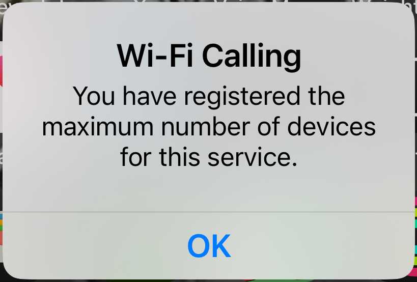You can try to solve the problem causing the “maximum number of devices” error by changing the state of Wi-Fi Calling. It seems that each device registers with the carrier’s network, and carriers’ systems don’t always update immediately. Here’s what to try: