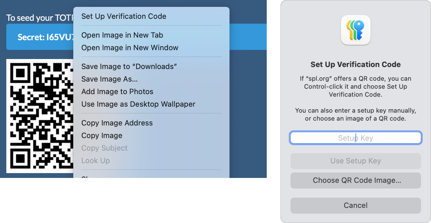 Apple managed this process extremely well once it started to support TOTPs, which it calls “verification codes.” On an account enrollment page displaying a TOTP enrollment QR code, you can Control/right-click the code in macOS or touch and hold on a Code in iOS/iPadOS and choose Set Up Verification Code (or similar language). This adds the secret to Passwords for that site.