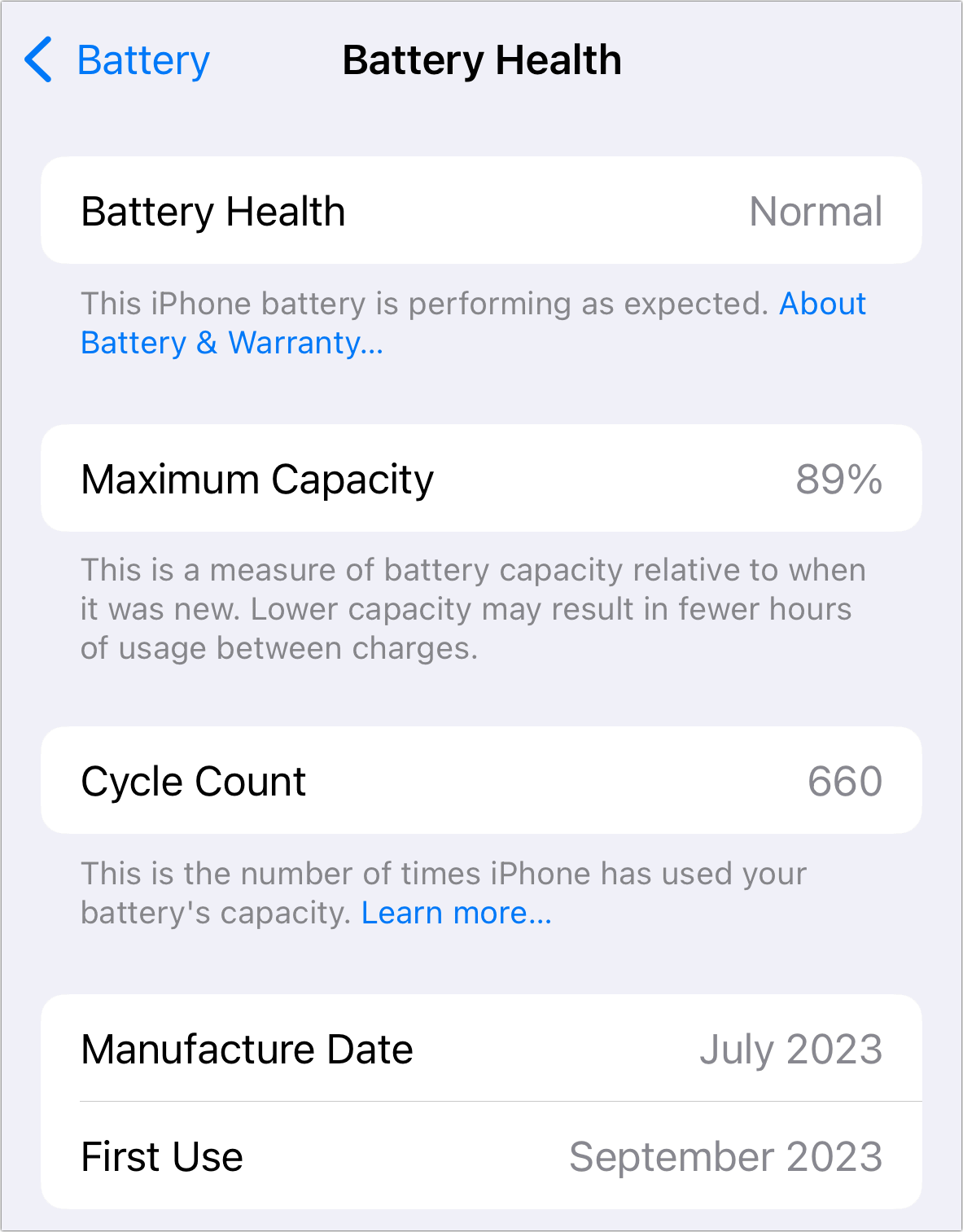 Before you proceed, check the condition of the battery in Settings > Battery. Battery Health should show Normal. Tap that item for additional information to see the current maximum capacity to which your battery can be charged. I’m currently using an iPhone 15 Pro that was put into use in September 2023, and after 660 cycles of using 100 percent of available capacity, my battery remains capable of an 89 percent charge. (A cycle is counted by Apple not just when you plug in to charge, but the equivalent of empty to full, even if that’s over multiple sessions of being plugged in.)