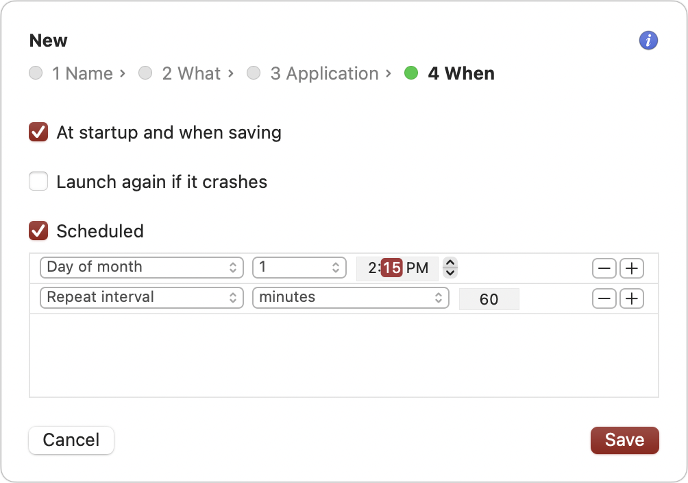 In Lingon, click the + icon at the top of the window, and the app guides you through four steps: