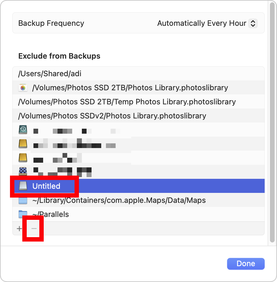 When you go to System Settings > General > Time Machine and click Options, you will see that all ExFAT and NTFS volumes appear in the Exclude from Backups list along with any items you added manually and all Time Machine volumes mounted on your Mac. However, unlike the items you added, when you select the external volume, note that the remove button (a minus sign at the bottom of the list) is grayed out and cannot be clicked. (It’s hard to see in the screen capture that it’s a lighter gray than the add button/plus sign.)
